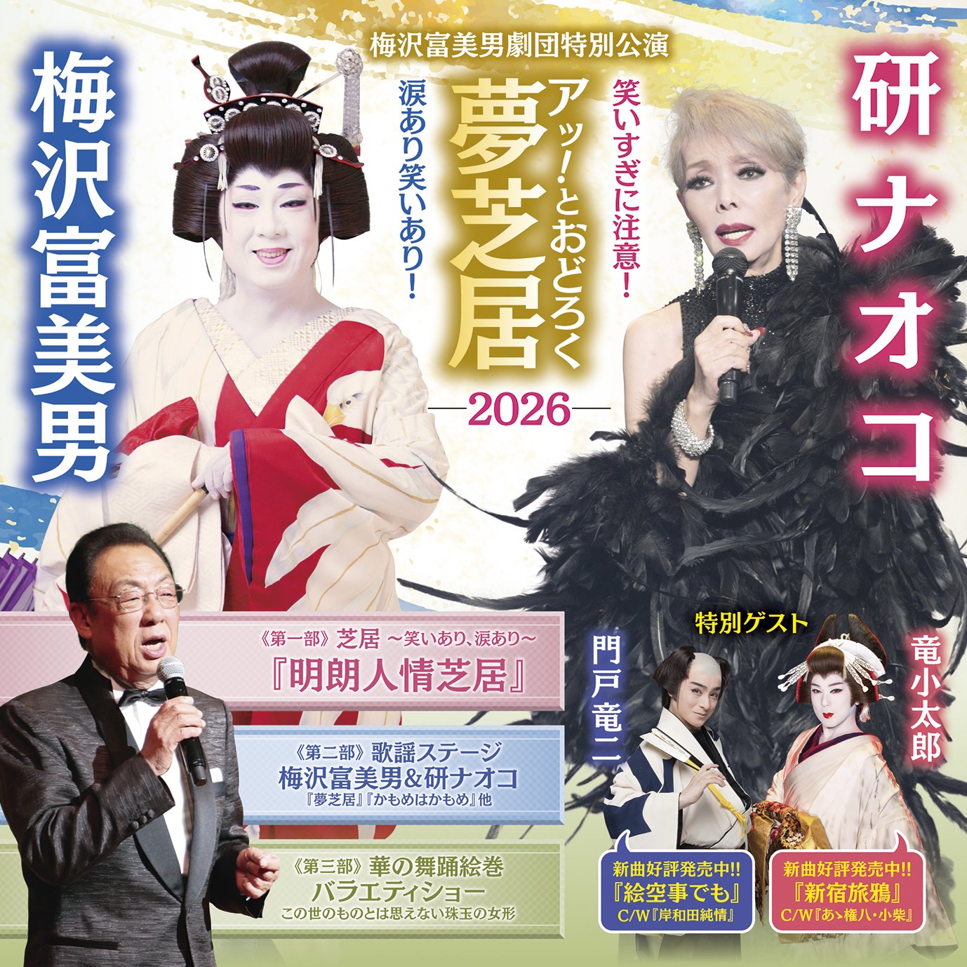 大衆演劇のスターとなった梅沢富美男が歌の世界に飛び込んだのは、1982年のこと。小椋佳作詞・作曲による『夢芝居』が、大ヒット。3万枚売れればヒット曲といわれた時代にあって、48万枚のセールスを記録。1983年には同曲で『第34回紅白歌合戦』に出場し、一躍歌謡界のトップスターの仲間入りを果たす。その低音ボイスは、艶やかな女形姿とは一転、男の色香を発する。2012年にリリースされたNHK東日本大震災復興応援ソング『花は咲く』(花は咲くプロジェクト)にボーカルとして参加。